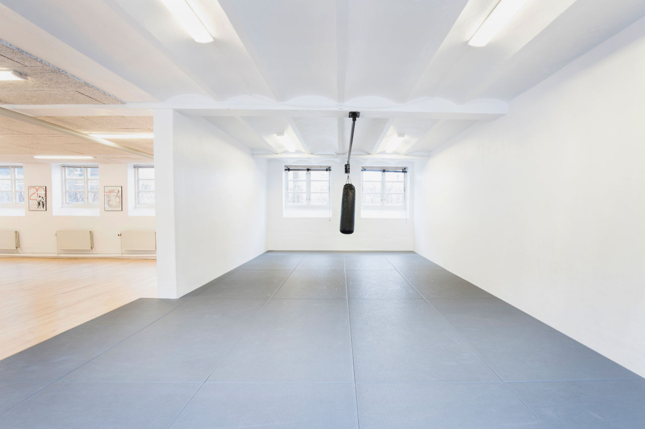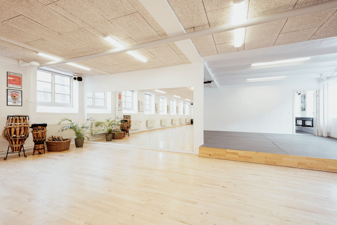Vores store lyse 200 kvadratmeter trænings sal består af et 50 m2 måtte-areal til udstrækning og akrobatik træning, samt 150 m2 med trægulv og spejle på endevæggen, perfekt til danseundervisning.